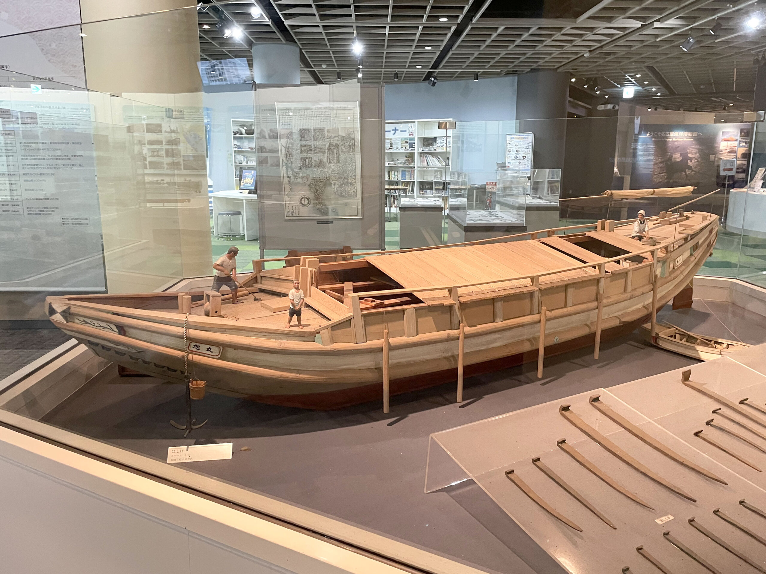 展示室の中には古代から中世、近代までの代表的な船舶の模型が展示され、フロアの中央には世界中の海洋民族の動画などが観られるBOXケースや資料が置かれています。