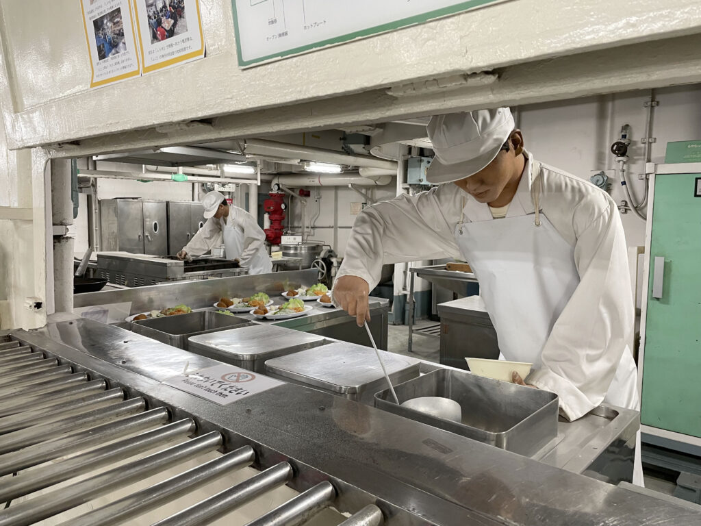 入り口から一番最初に食堂と厨房があり、そこから士官用〜一般の乗組員まで。