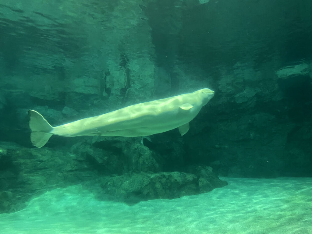 ベルーガ(白イルカ)は離れたところに展示されており、環境が違うのかグリーンの水槽が神秘的でした。