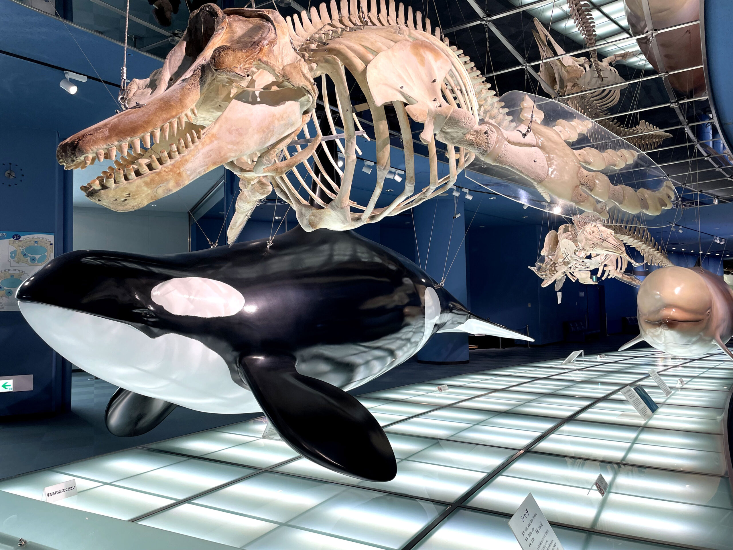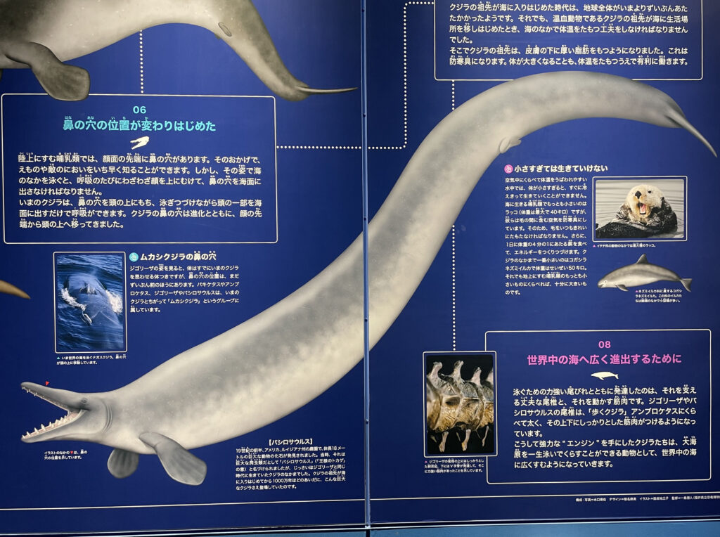 水槽の奥にある骨格模型の展示は、樹脂などでヒレのサイズなどがわかる仕様になっていて、泳いでいるような展示がかっこいいです。海獣たちの進化の歴史、種類などのパネルも充実していました。