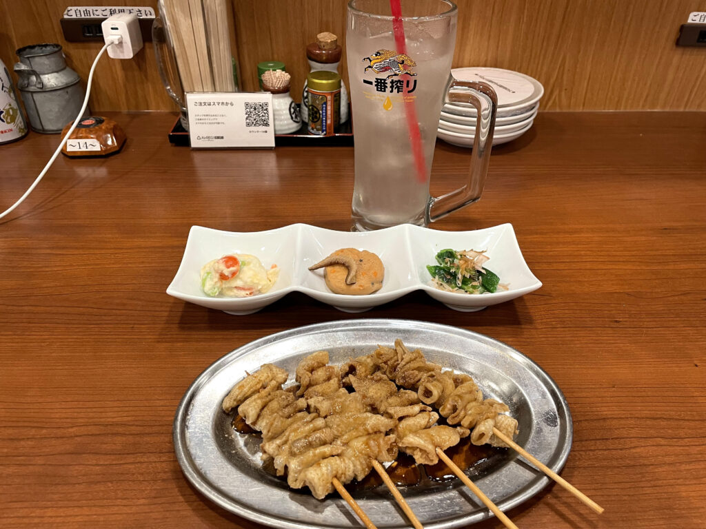 少し早いですが駅前の焼き鳥屋さんで手羽先と鶏皮齧り付いて来ました☺️